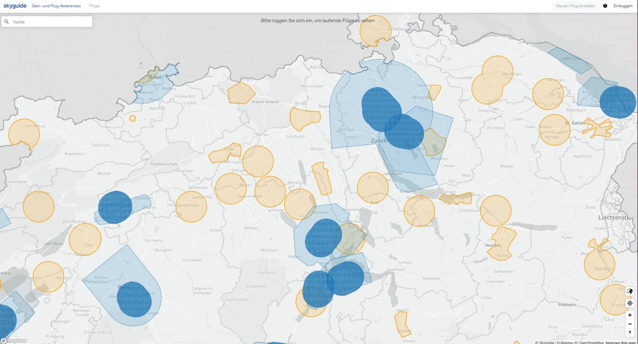 Gewinnen Sie einen Überblick über die wichtigsten Beschränkungen und Anforderungen für Drohnenoperationen, indem Sie in der Kartenansicht den gewünschten Ort suchen wählen.