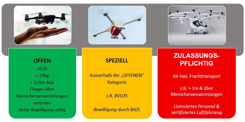 Die Drohnen-Regulierung unterscheidet zwischen drei verschiedenen Betriebskategorien: "OFFEN", "SPEZIELL" und "ZULASSUNGSPFLICHTIG". Die drei Kategorien definieren sich durch unterschiedliche Sicherheitsanforderungen, welche vom Risiko des Betriebs abhängen.