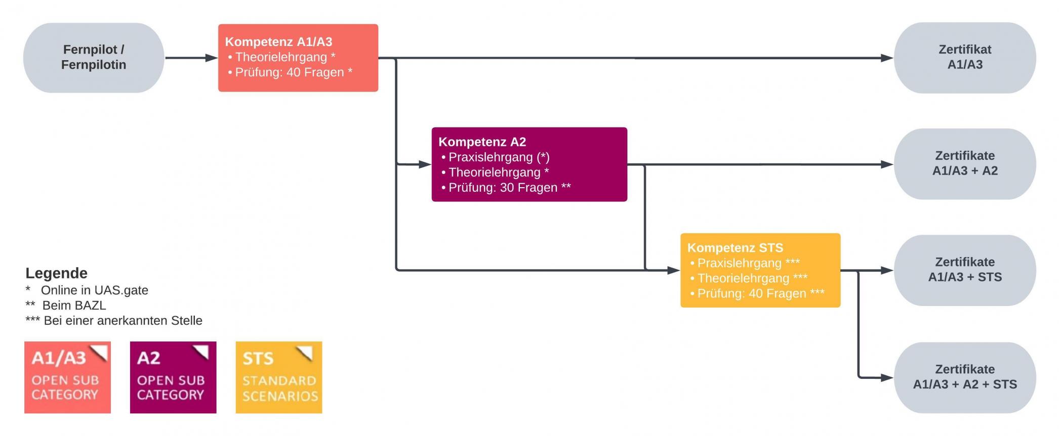 STS: Das BAZL bietet eine Theorieprüfung für Fernpilotinnen und Fernpiloten an, die beabsichtigen, gemäss einem STS zu fliegen. Weitere Informationen über den Inhalt der STS-Theorieprüfung und über die praktische Prüfung finden Sie unter Europäische Standardszenarien (admin.ch). Bitte beachten Sie, dass für das Fliegen nach STS weiterhin eine Bewilligung erforderlich ist. [spezielle Kategorie]