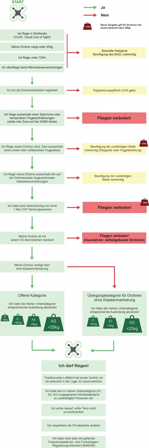 Der Drohnen-Guide gibt einen Überblick über die geltenden Regeln (grüne Boxen) und gibt Auskunft, in welchen Fällen ein Drohnenflug bewilligungspflichtig wird (gelbe Boxen).