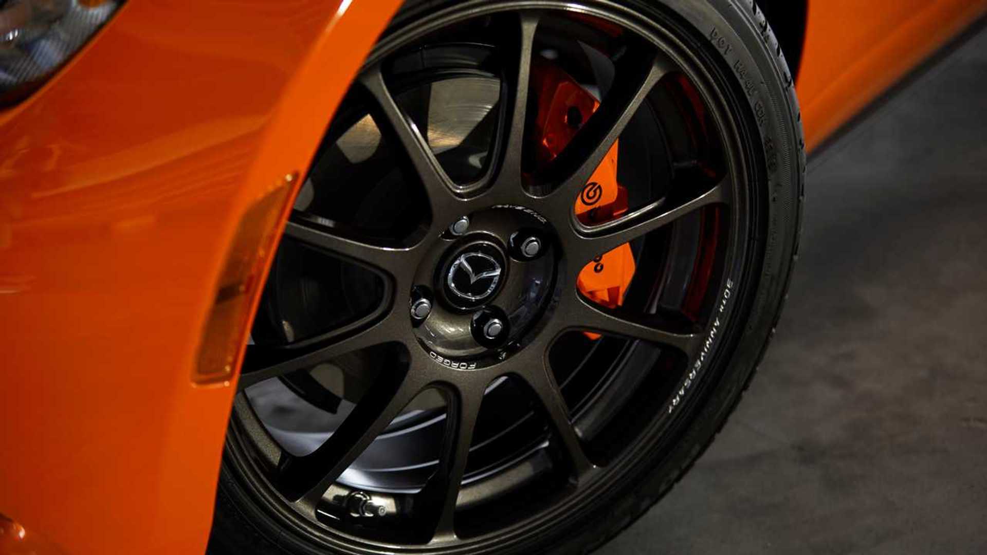 Das 30th Anniversary Modell des Mazda MX-5 wurde in einer auffälligen „Racing Orange“ Lackierung präsentiert, die speziell für diese Ausgabe entwickelt wurde. Diese Farbe soll die Dynamik und die Leidenschaft, die der MX-5 über die Jahre verkörpert hat, widerspiegeln. Ergänzt wird das äußere Erscheinungsbild durch spezielle 17-Zoll Rays-Schmiederäder in Dunkelgrau, die nicht nur optisch ansprechend sind, sondern auch zur Gewichtsreduktion beitragen.