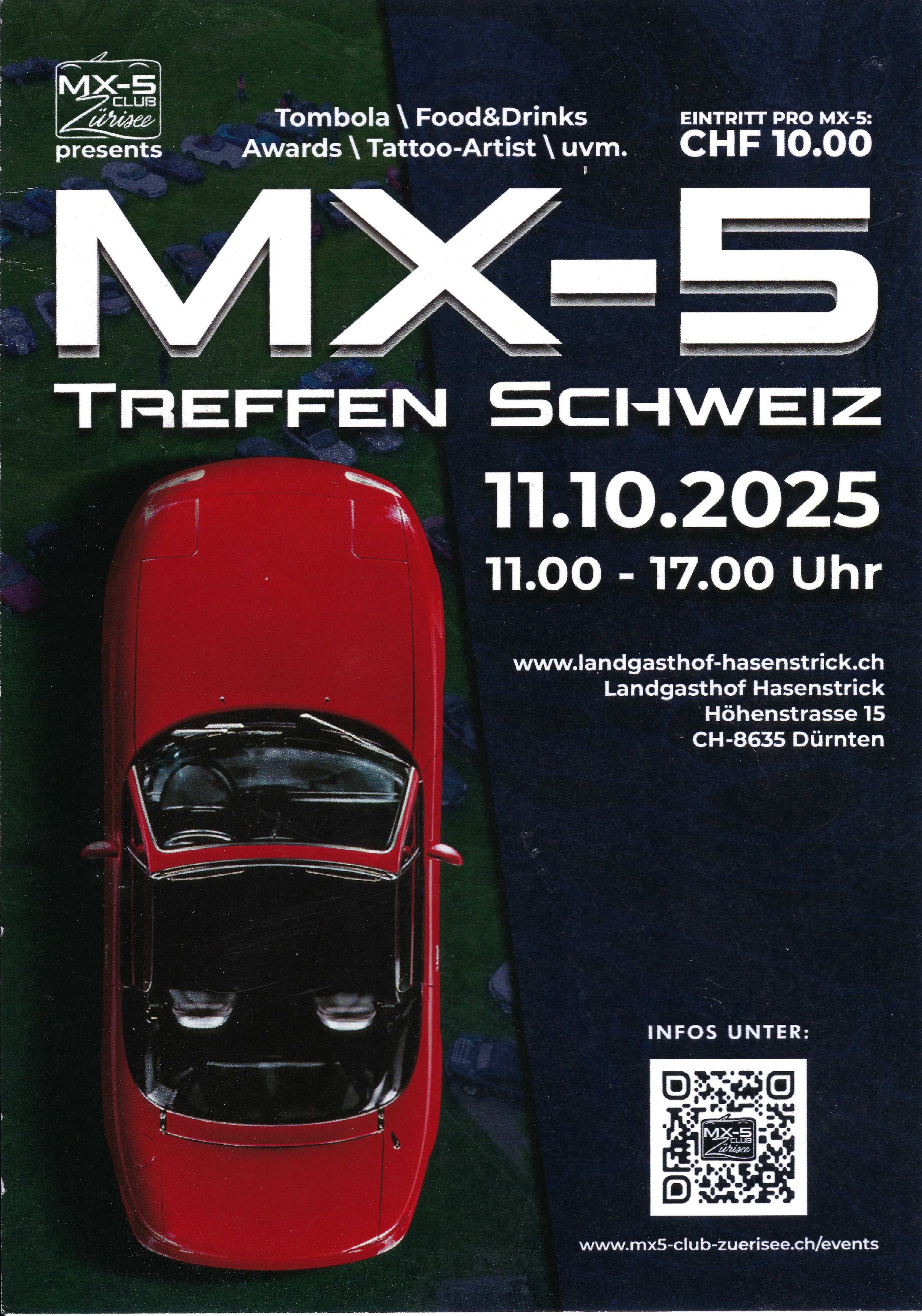 Ich freue mich riesig, euch mitteilen zu können, dass ich beim größten MX-5-Treffen der Schweiz dabei sein werde! Es wird garantiert ein unvergessliches Erlebnis, und ich kann’s kaum erwarten, die Highlights mit euch zu teilen.