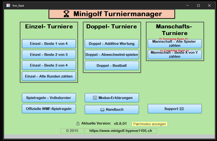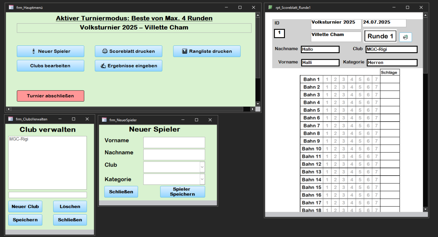 Minigolf ist nicht nur ein Spiel – es ist Leidenschaft, Taktik und Teamgeist. Genau darum habe ich meinen eigenen Minigolf-Turniermanager entwickelt: Eine Access-Datenbank, mit der du Turniere ganz einfach planen, verwalten und auswerten kannst – egal ob Freizeitturnier, Clubmeisterschaft oder Volks-Event.